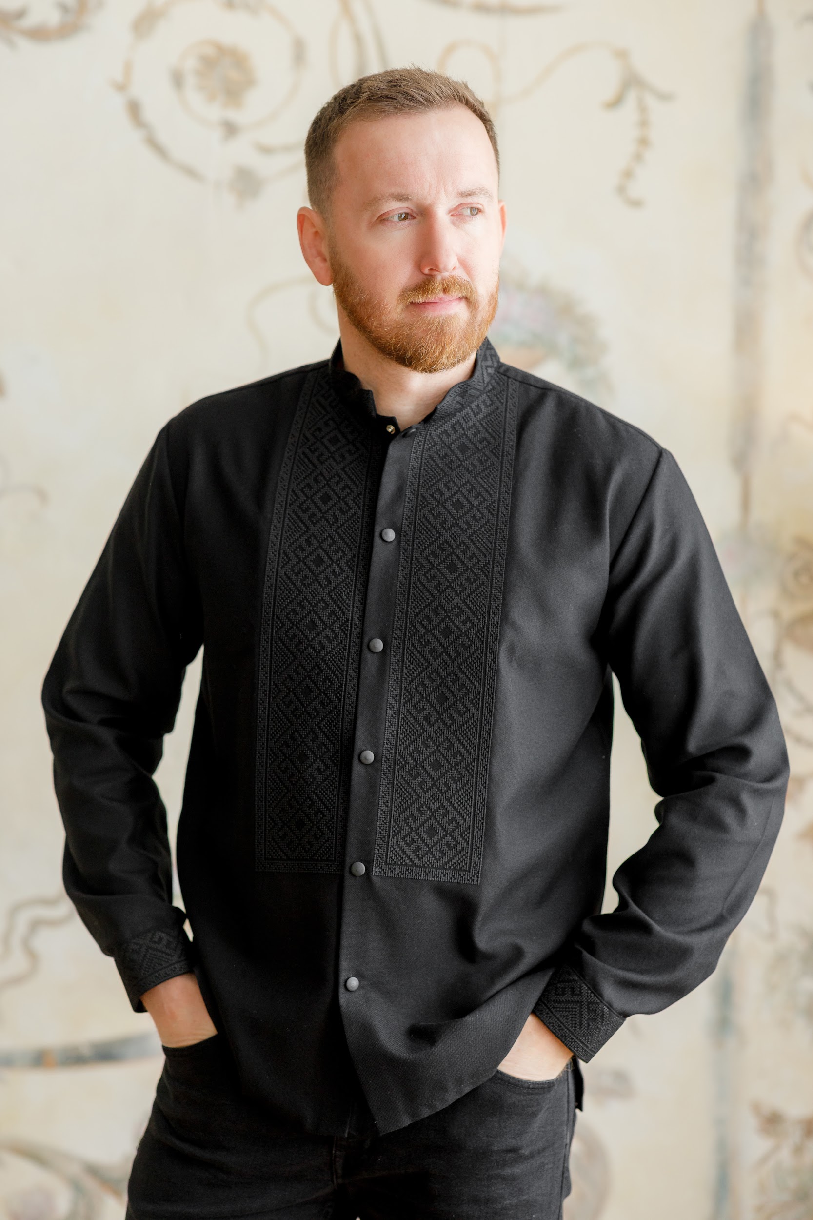 Чоловіча вишиванка "чорним по чорному" на кнопки від ТМ КАЛИНА