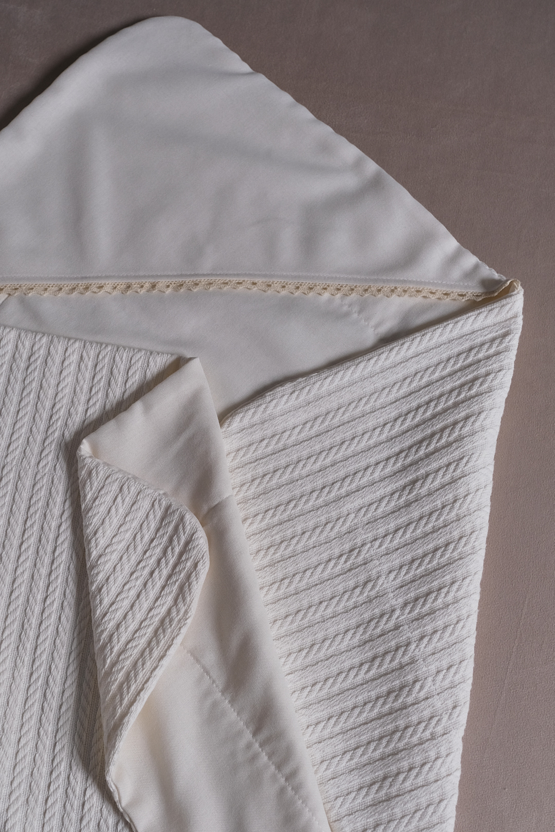 Крижма подвійна: зовнішній бік виконаний з тканини піке «косичка», внутрішній — з натуральної бавовни.