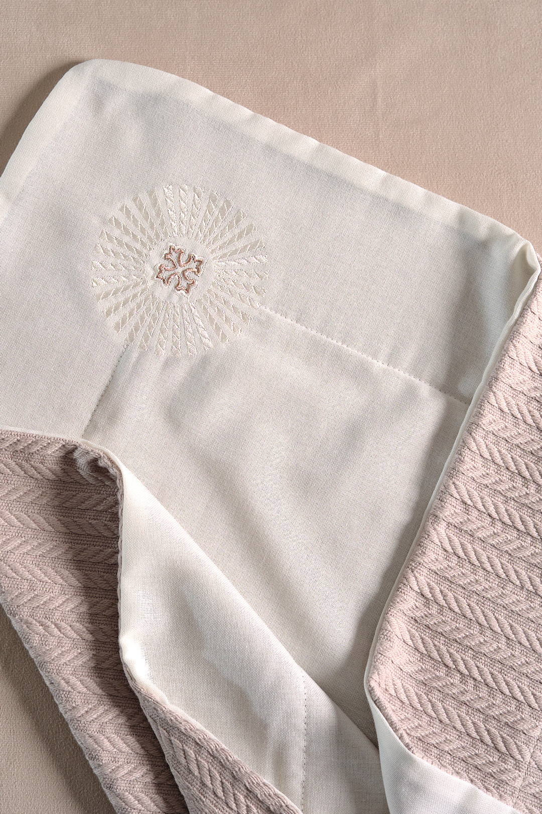 Крижма подвійна: зовнішній бік виконаний з тканини піке «косичка», внутрішній — з натуральної бавовни.