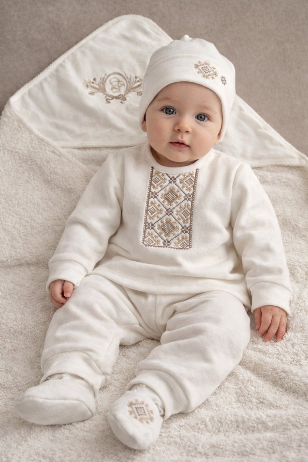 Теплий вишитий костюм для хрещення хлопчика "Світлий дотик " молочного кольору