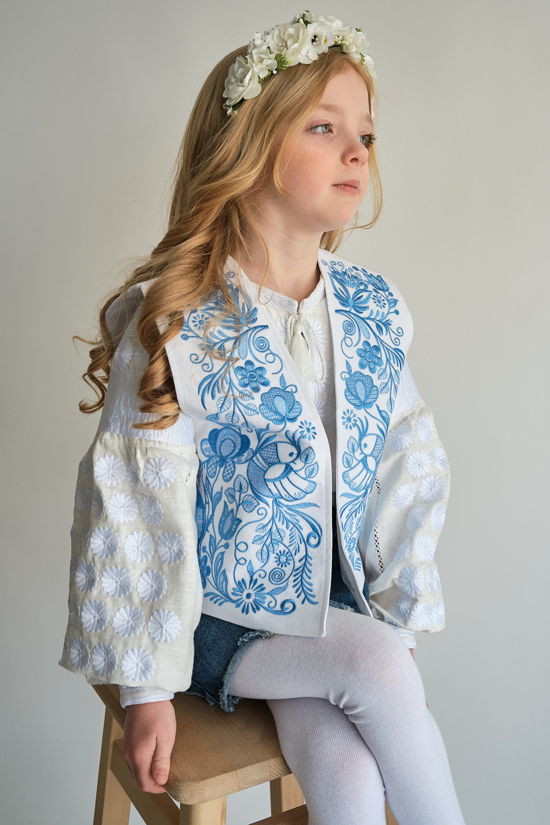 Жилетка вишита для дівчаток (льон) "Райська пташка" блакитного кольору від ТМ КАЛИНА