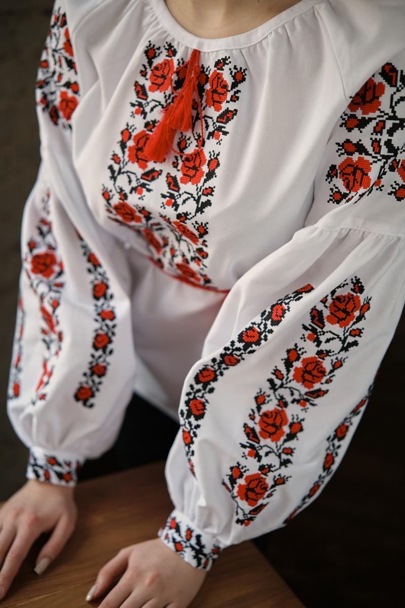 Жіноча вишиванка "Троянди червоно-чорні" – це поєднання вишуканої української традиції та сучасного стилю. Виготовлена з натурального домотканого полотна, вона забезпечує комфорт та довговічність. Машинна вишивка хрестиком виконана у червоно-чорній гамі, що символізує силу, пристрасть та незламність духу. Червоні троянди у поєднанні з чорним орнаментом підкреслюють елегантність і багатство української культури.