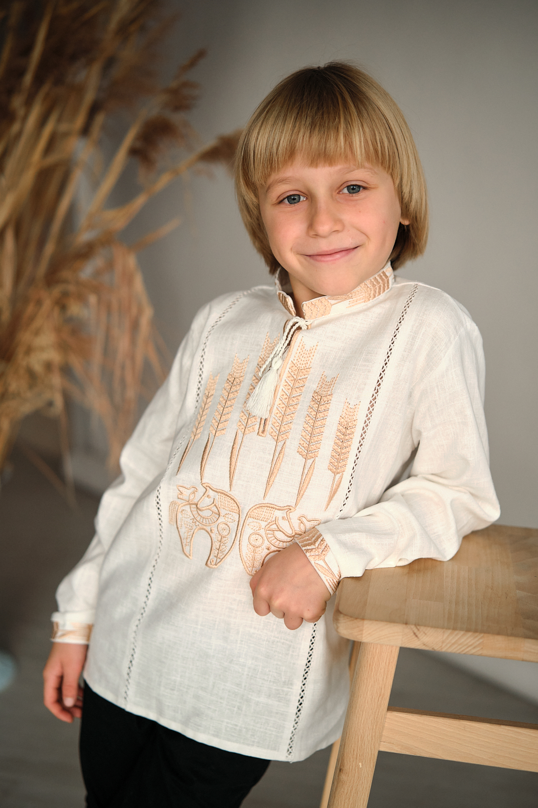 Вишиванка для хлопчика з натуральної тканини (кропива) молочна основа "Коники" від ТМ КАЛИНА