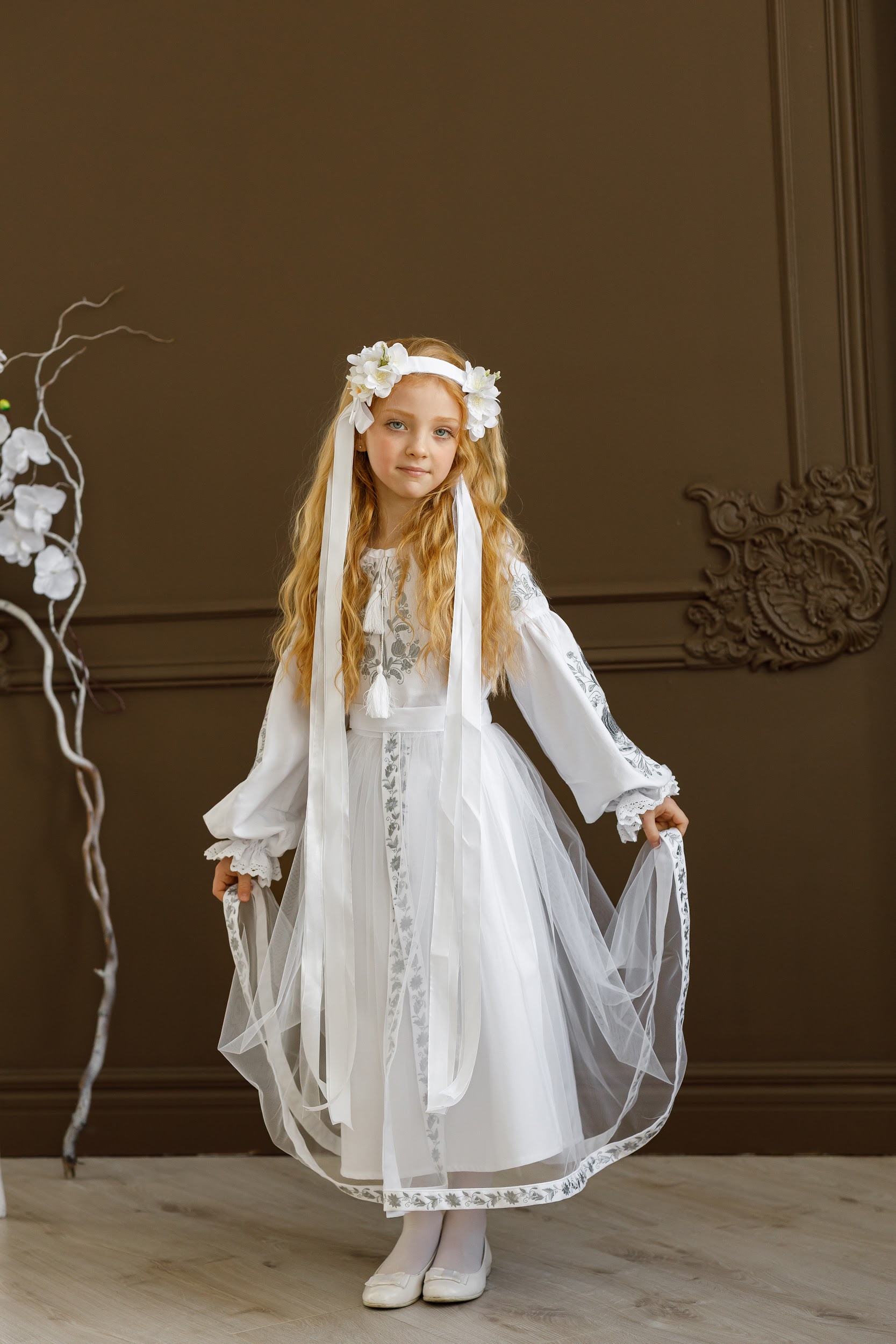 Вишита сукня для дівчинки з євросіткою "Весняний цвіт" сірий колір