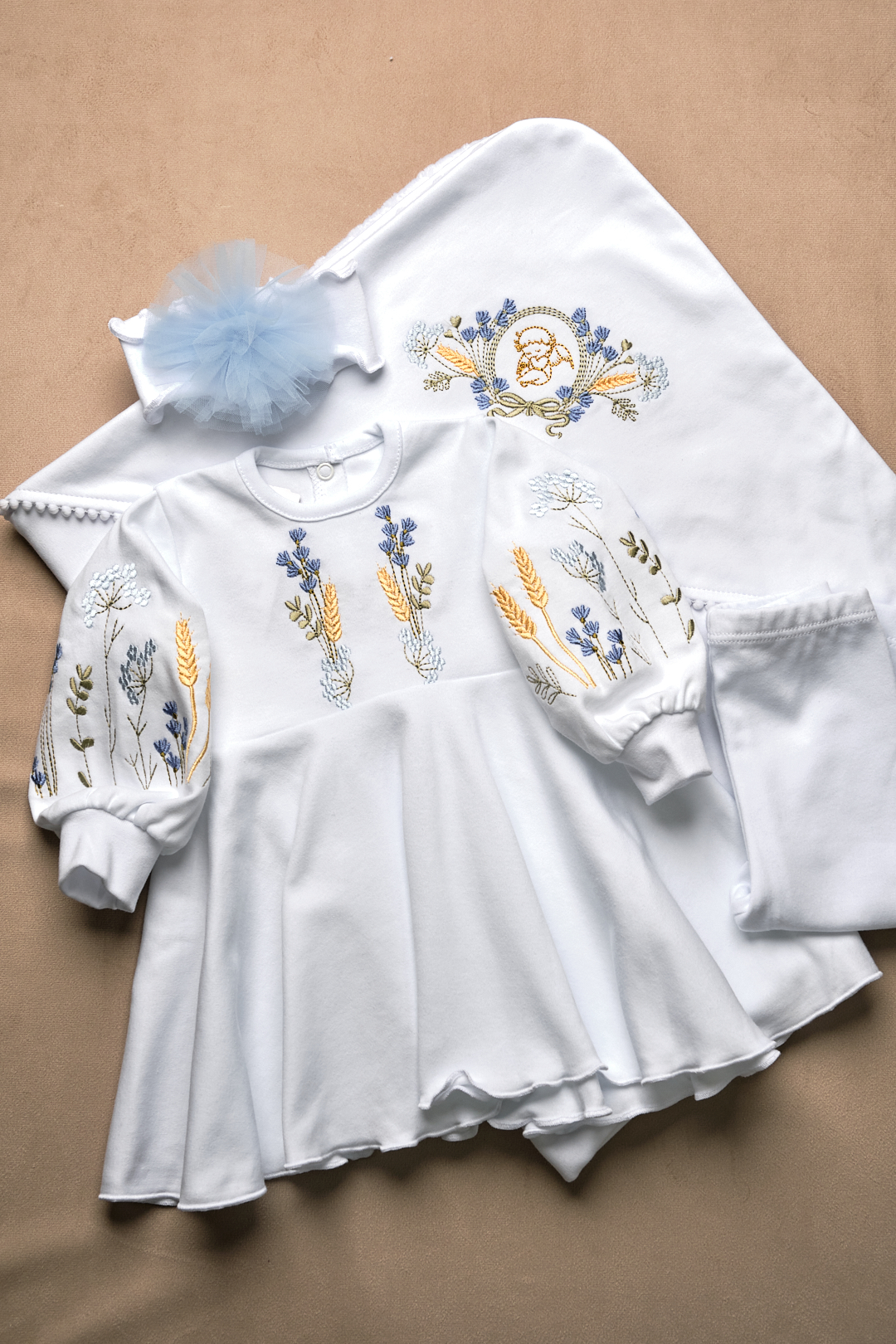Ніжний набір для хрещення дівчинки з вишивкою "Квіти в колосках"