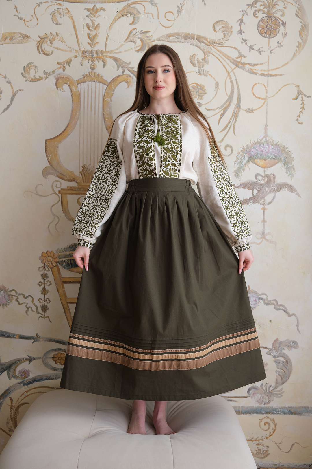 Жіноча спідничця оливкового кольору до вишиванки